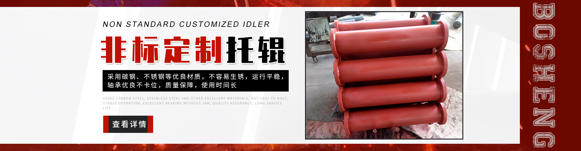 泰安博晟礦山機械有限公司位于山東泰安新泰市汶南鎮(zhèn)陳糧村。緊鄰京滬、京福、萊新高速公路。公路交通極為方便,環(huán)境優(yōu)美。公司主要生產(chǎn):托輥、托輥配件、托輥支架等皮帶輸送機配件。歡迎各界商友前來洽談考察。聯(lián)系電話:13954880316. 泰安博晟礦山機械有限公司采用國際標(biāo)準(zhǔn)設(shè)計、制造技術(shù),將托輥的設(shè)計和制造提高到了一個更高的水平,生產(chǎn)的托輥具有小的旋轉(zhuǎn)阻力,長的壽命,小的維修工作量和高的承載能力。鋼管采用托輥專用高頻焊管,管內(nèi)做去刺處理,圓度控制在特殊的公差范圍之內(nèi)。軸是按標(biāo)準(zhǔn)公差加工的冷拉鋼制造。軸承座采用進口冷扎鋼板經(jīng)多次工藝沖壓而成。托輥管和軸承座被自動焊接機械手焊接在一起,形成一個具有很高強度的整體構(gòu)造。托輥軸承采用國內(nèi)外知名品牌的大游隙深溝球雙密封軸承,使托輥具有理想的靜平衡和動平衡,其旋轉(zhuǎn)阻力優(yōu)于國標(biāo)。托輥密封采用綜合國外和國內(nèi)迷宮式密封的特點進行了專門設(shè)計,內(nèi)充耐高速高溫和超低溫抗氧化鋰基酯,有效防止雜質(zhì)、水、空氣對托輥內(nèi)部的侵蝕。 目前我們托輥系列產(chǎn)品有槽形上調(diào)心托輥組、槽形托輥、槽形下調(diào)心托輥組、承載托輥、緩沖托輥、回程托輥組、螺旋托輥、摩擦上調(diào)心托輥組、平行緩沖托輥組、平行上調(diào)心托輥、礦用托輥、煤礦專用托輥、梳型托輥、樹脂托輥、陶瓷托輥、橡膠托輥、錐形托輥、立輥等。規(guī)格:直徑50-219mm;長度190-2600mm。 泰安博晟礦山機械有限公司竭誠愿與廣大客戶合作,共同發(fā)展開發(fā)新技術(shù)新項目。泰安博晟礦山機械有限公司秉承